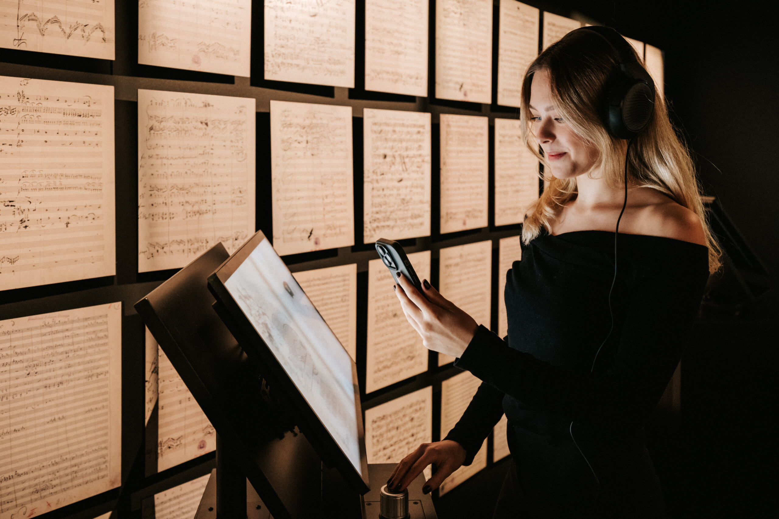 The exhibition uses location-tracked headphones, which automatically connect to the nearest multimedia station, providing synchronized audio and interactive content. This system allows for a seamless and personalized experience as visitors explore the historical and musical themes of each section.